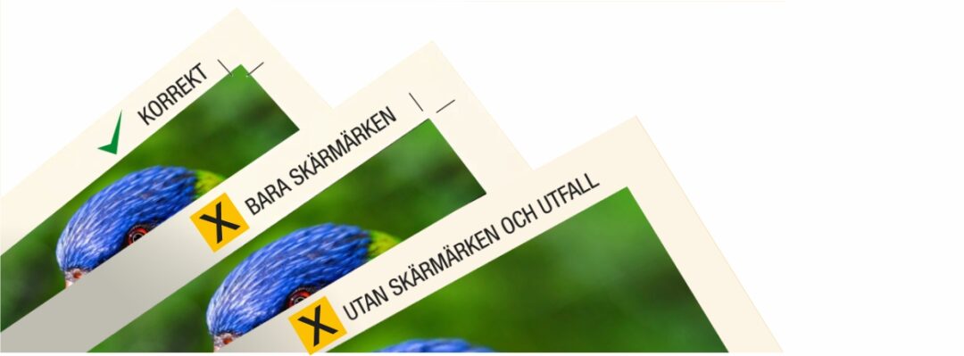 Om dina bilder eller grafik ska gå till kanten av pappret måste du skapa utfall. Genom detta slipper du risken att få en vit kant vid renskärning när pappret skärs i rätt format. Gör utfallet minst 3 mm och dra bilden fram till utfallet.  När du sedan skriver ut din tryckfärdiga pdf – välj att visa skärmärken.